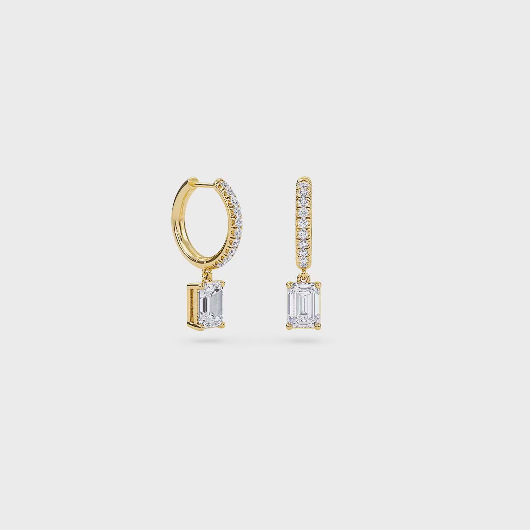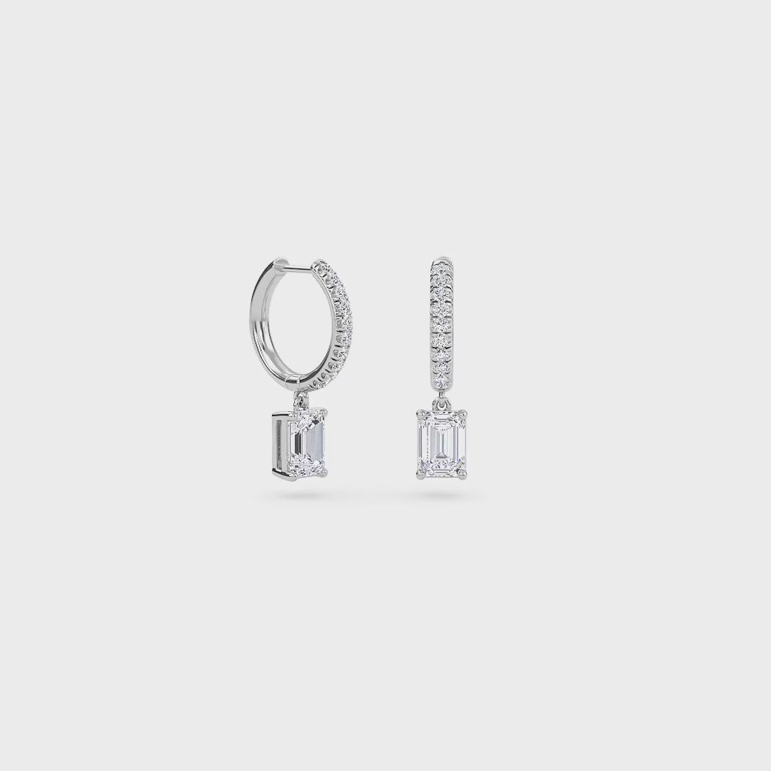 1.40 Carat Emerald Cut Diamond Drop Hoop Earrings with Round Side Stones – Elegant Fine Jewelry